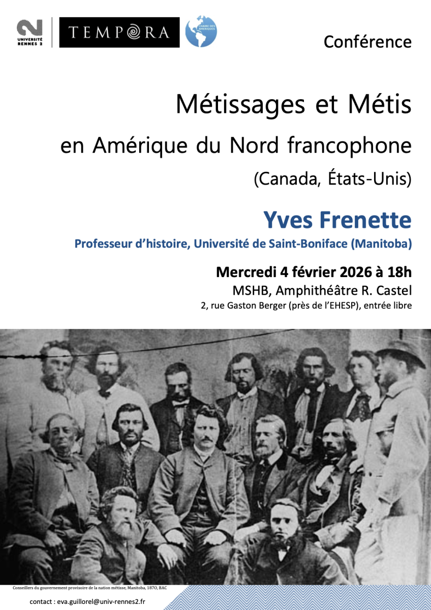 Yves Frenette, professeur d’histoire à l’université de Saint-Boniface au Manitoba, professeur invité à Rennes 2 entre le 20 janvier et le 20 février 2026 grâce à une chaire de l’Institut des Amériques, présente une conférence ouverte au public intitulée « Métissages et Métis en Amérique du Nord francophone (Canada, États-Unis) » le mercredi 4 février 2026 à 18h à la MSHB, dans l’amphi R. Castel.